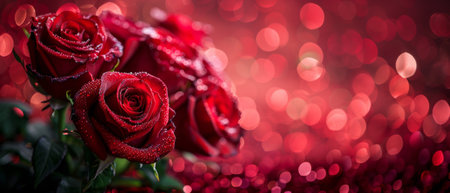 A decorative card for Valentine's Day or a wedding with red roses and glowing bokeh