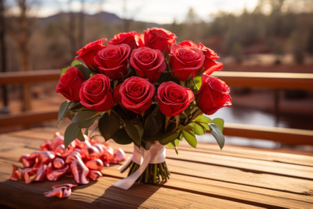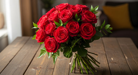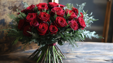 A bouquet of red roses with delicate greenery, placed on a rustic wooden table, representing timeless love and affection.