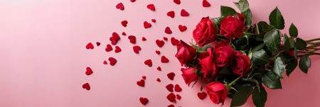 A beautiful arrangement of fresh red roses, accented with heartshaped petals, set against a soft pink background