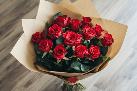 A beautiful bouquet features vibrant red roses arranged elegantly in kraft paper, resting on a rustic wooden table. The natural lighting enhances the rich colors and textures.