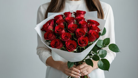 Vibrant red roses held by a woman in a white blouse against a neutral background