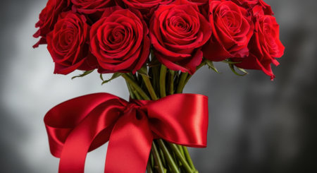 A striking close-up photograph captures a beautiful bouquet of deep red roses. The flowers are tightly bundled, showcasing their velvety petals and rich color saturation. The stems are neatly tied together with a large, glossy red satin ribbon formed into an elegant bow at the base. The background is softly blurred in a gradient of dark gray, enhancing the vibrant red color of the roses and ribbon, creating a strong visual contrast. This image conveys feelings of romance, love, and celebration, perfect for occasions like Valentine's Day or anniversaries.