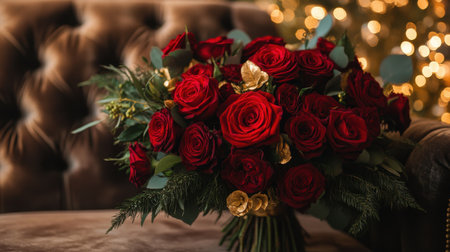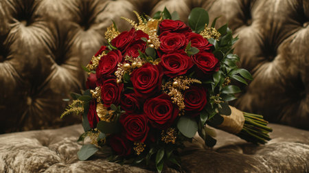 A glamorous bridal bouquet with red roses and gold accents, placed on a luxurious velvet surface.