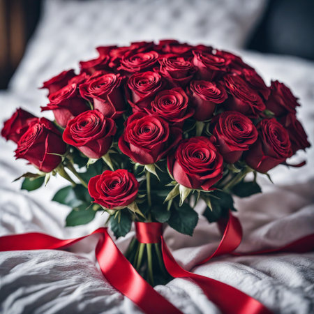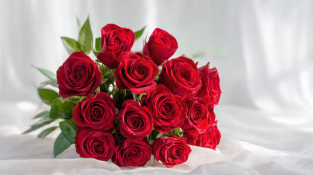 A stunning bouquet of fresh red roses, beautifully arranged on soft white fabric, symbolizing love and romance. Ideal for weddings, anniversaries, or special occasions.
