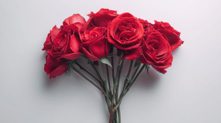 A beautiful arrangement of vibrant red roses on a soft white background, perfect for capturing the essence of romance and natural beauty. Ideal for various design themes.
