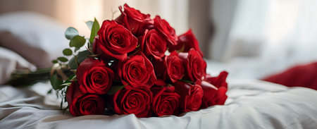 A soft bed adorned with a delicate bouquet of roses in a warmly lit room, romantic, honeymoon and Valentine's concept.