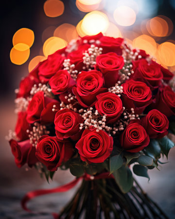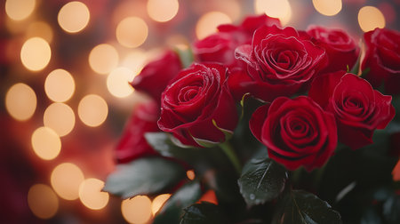 a close up of a bouquet of red roses with blurred bokeh lights in the background creating a romantic vibe