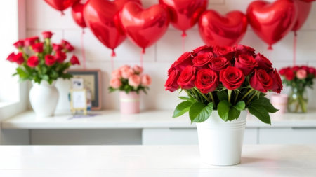 Floristic Valentine banner with red roses in white bucket and heart shaped balloon. White interior. Copy space, empty space for text