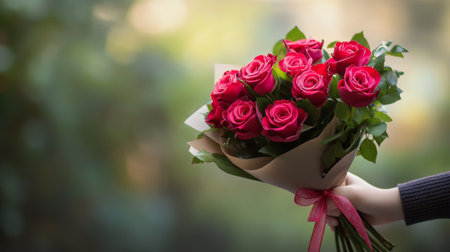 A graceful rose bouquet wrapped in a ribbon, held by a person, with a soft-focus background of greenery, symbolizing a special occasion or celebration.