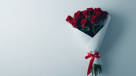 A stunning bouquet of fresh red roses elegantly wrapped in white paper and adorned with a red ribbon. Perfect for expressing love and passion.