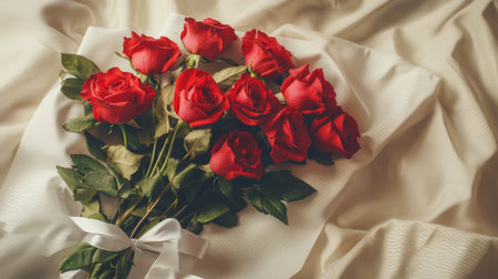 A stunning arrangement of red roses beautifully presented on soft white fabric. This image captures the essence of romance, making it perfect for various occasions.