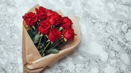 Elegant Bouquet of Red Roses with Kraft Paper on Marble Surface, Concept of Romance, Gift Giving, Floral Arrangement, and Nature Beauty in Home Decor. Valentine's Day. Copy space.