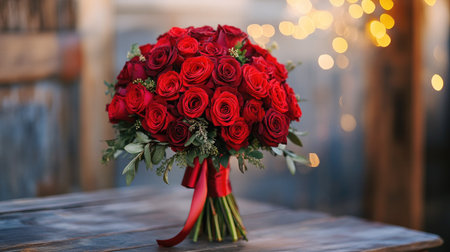 A stunning bouquet of red roses tied with a satin ribbon, placed on a rustic wooden table.