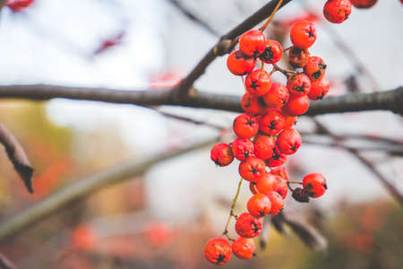 Blurred abstract autumn background. Red rowan berries on the rowan tree branches. high quality photo