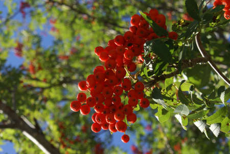 detail of Rowan Berries (Sorbus aucuparia) against of blue sky