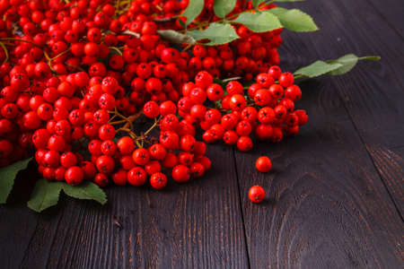 Juicy mountain ash with water drops on a dark background. Rowan branch on the table close-up