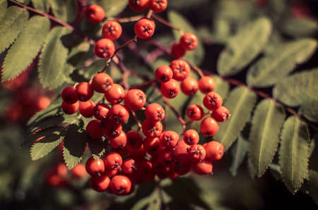 Beautiful autumn background with bunches of red rowan berries on blurred nature. Selective focus. High quality photo