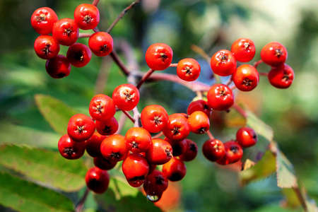 Hanging red rowan (Sorbus aucuparia) berries on green rowan tree in the forest during early morning and early autumn time