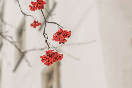 Red rowan berries on a tree branch in winter, close up. Selective focus on bunches of berries