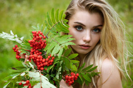 Portrait of a young beautiful blonde woman with a bouquet of rowan berries in nature close-up