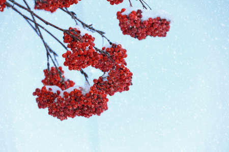 Seasonal berries. Christmas rowan berry branch. Hawthorn berries bunch. Rowanberry in snow. Berries of red ash in snow. Winter background. Frosted red berries. Frozen food. Climate control