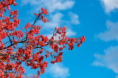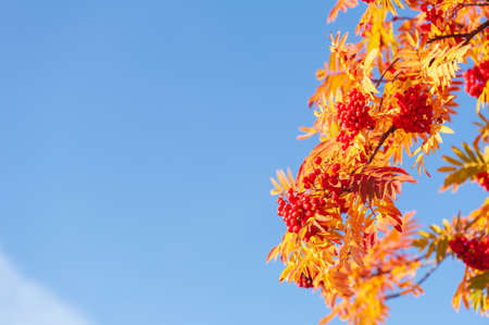 Bunches of red rowan against blue sky. Background with copy space. Rowan berries. Autumn mood.