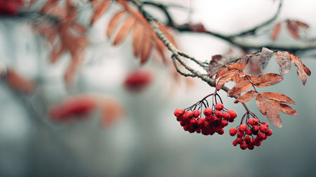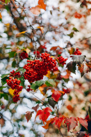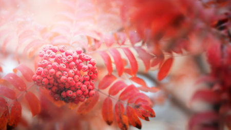 Bright red rowan berries clustered on a branch, surrounded by vivid orange and red autumn leaves. natural fall season scene with soft light.