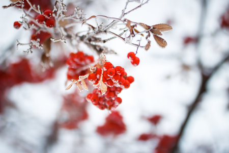 Frozen red berries covered with frost crystals on branches. Winter nature background showing ice-covered rowan or viburnum fruits in cold weather conditions.