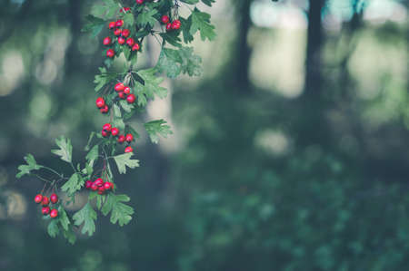 Branch of wild ripe hawthorn - Crataegus - in the forest. Red berries on deep green nature background.