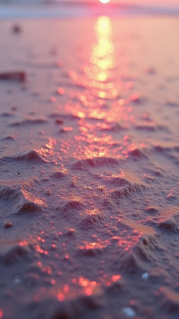 Sunlit sand textures at sunset with glittering pink reflections. That the image is generated using AI.