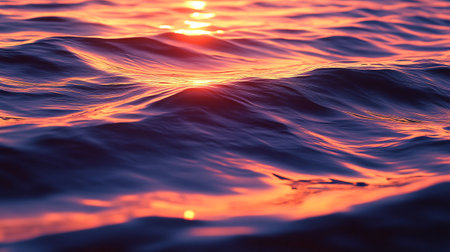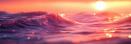 A digital illustration of the sea waves during sunset, with gentle ripples and sparkling reflections of the pink and orange sky, capturing the calming, tranquil movement of the water, banner