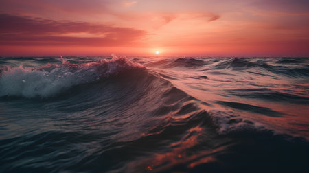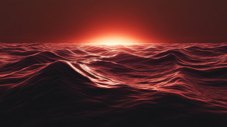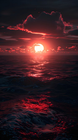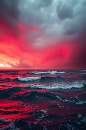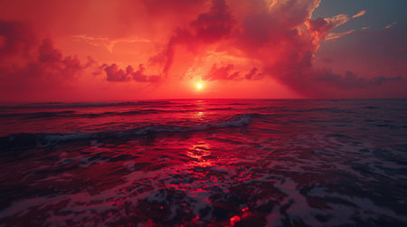 power of nature with this intense red sunset over dark ocean waves. Dramatic and cinematic, the fiery sky reflects on the water's surface. Perfect for themes of passion, climate cha