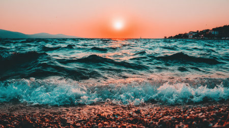 Stunning seascape at dusk. The sun dips below the horizon, illuminating the sky in shades of orange and pink, while turquoise waves roll onto a stony beach.
