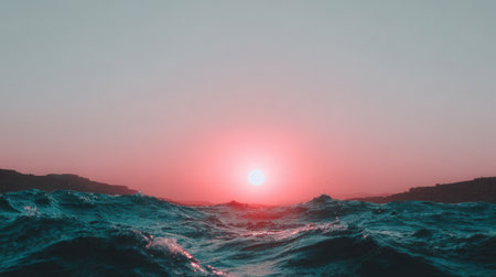 A stunning view from the waters surface of a bright pink sun setting between distant hills, casting a warm glow over the choppy, deep teal waves of the sea.