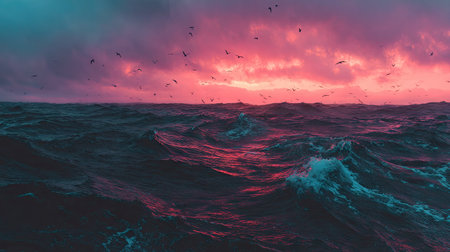 An image showcases a dynamic ocean scene under a colorful sky. The waves are in motion and the sky is a mix of red and purple hues, with some birds flying overhead. The atmosphere suggests a day at sea, perhaps suitable for editorial use or as a decorative element.