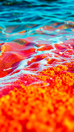 Close-up view of undulating water with vivid hues of blue, red, and orange. The light plays on the surface, creating a dynamic and colorful aquatic scene.