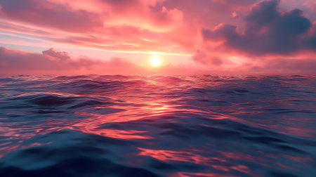 A serene pink sunset casts a warm glow over calm ocean waves, creating a tranquil atmosphere filled with soft clouds and reflections. This beautiful scene invites relaxation and evokes the calming essence of nature.