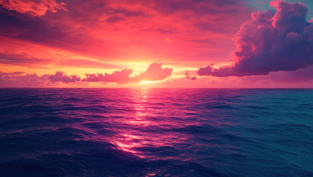 Surreal sunset over ocean waves, vibrant pink and teal colors create a calming atmosphere, perfect for relaxation and meditation