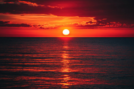 Red sunset over the sea. The sun is large and round, the sky above it is red in color. There's nothing around except water. --ar 3:2 --v 6.1 Job ID: 590cc905-6457-4d14-b370-7081ade2e21a