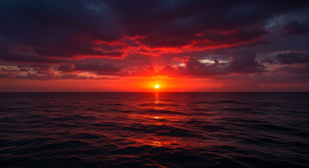A stunning sunset over the ocean, with the sun casting a red glow on the water and clouds.