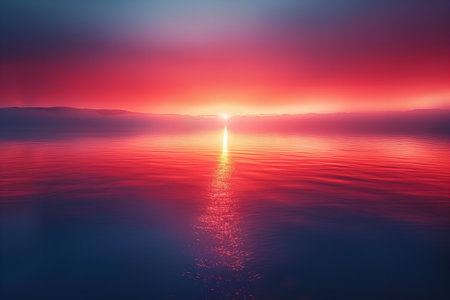 Fiery sunset over a calm body of water, with the sun casting a dramatic reflection on the still ocean surface. The colors are vibrant and bold, creating a beautiful natural scene.
