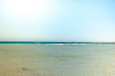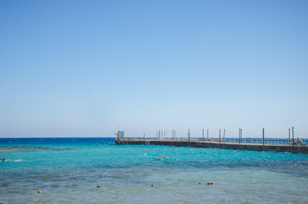 beach with coral reef, turquoise sea and long pontoons across the reef, seascape background. farsha or gold beach, sharm el sheikh, Egypt
