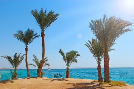 View of tropical resort with palm trees sand and sandy beach. Paradise island on seashore of Red sea. Palm trees and bench on sandy shore of tropical island. Tourists left island on ship