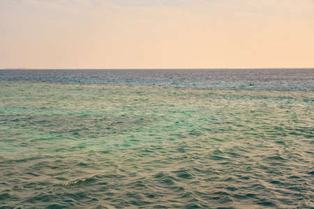 Wide shot of a beautiful clear turquoise sea ocean water surface with low ripples and subtle waves on seascape background, horizontal picture. Vacation travel background with copyspace for your text