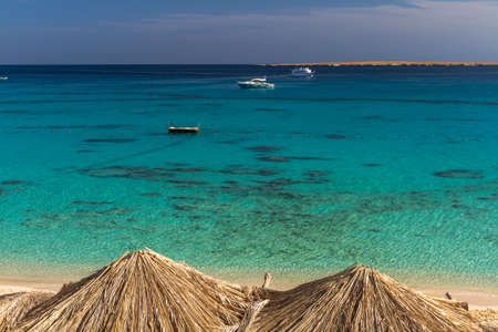 Mahmya island in red sea, Egypt, blue water, sky with clouds and boats