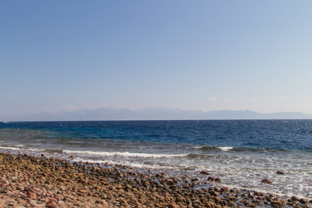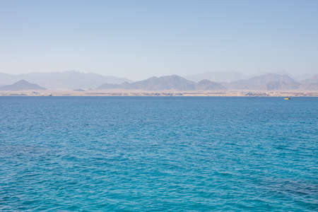 The coastline of the Red Sea and the mountains in the background. Egypt, the Sinai Peninsula, Dahab.