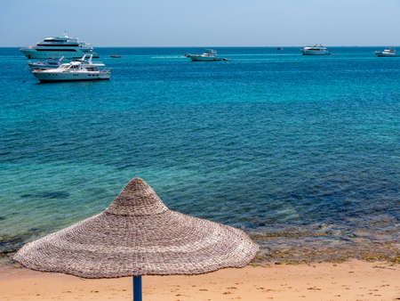 Egyptian beach in february. White ship moored to wharf, medium view. Geen thatch palms under clear blue sky. Selective soft focus. Blurred background