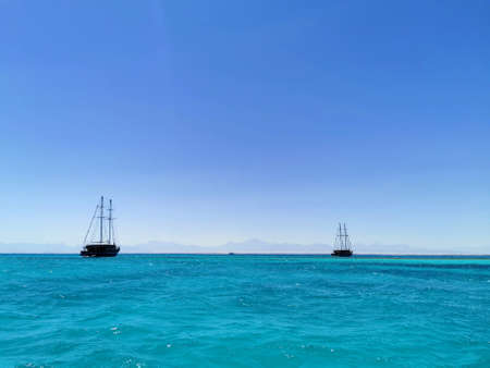 Sharm El Sheikh, Egypt - February 16, 2020: Sail boat ship with tourists in Ras Mohamed National Park in the Red Sea, Sharm El Sheikh, Egypt