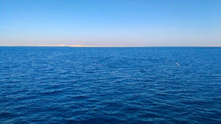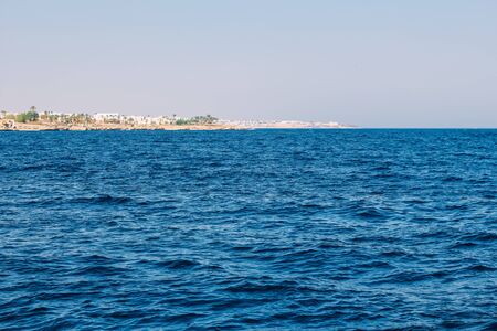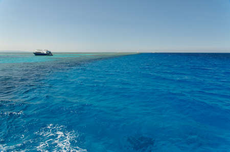 Red Sea view from the deck of a yacht.It has a dark blue color in the deep water area and a clear turquoise color in the shallower water area. Lots of yachts and pleasure boats sail along the coast