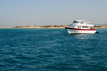 Pleasure tourist boat with passengers sailing in the clear blue water of the Red Sea